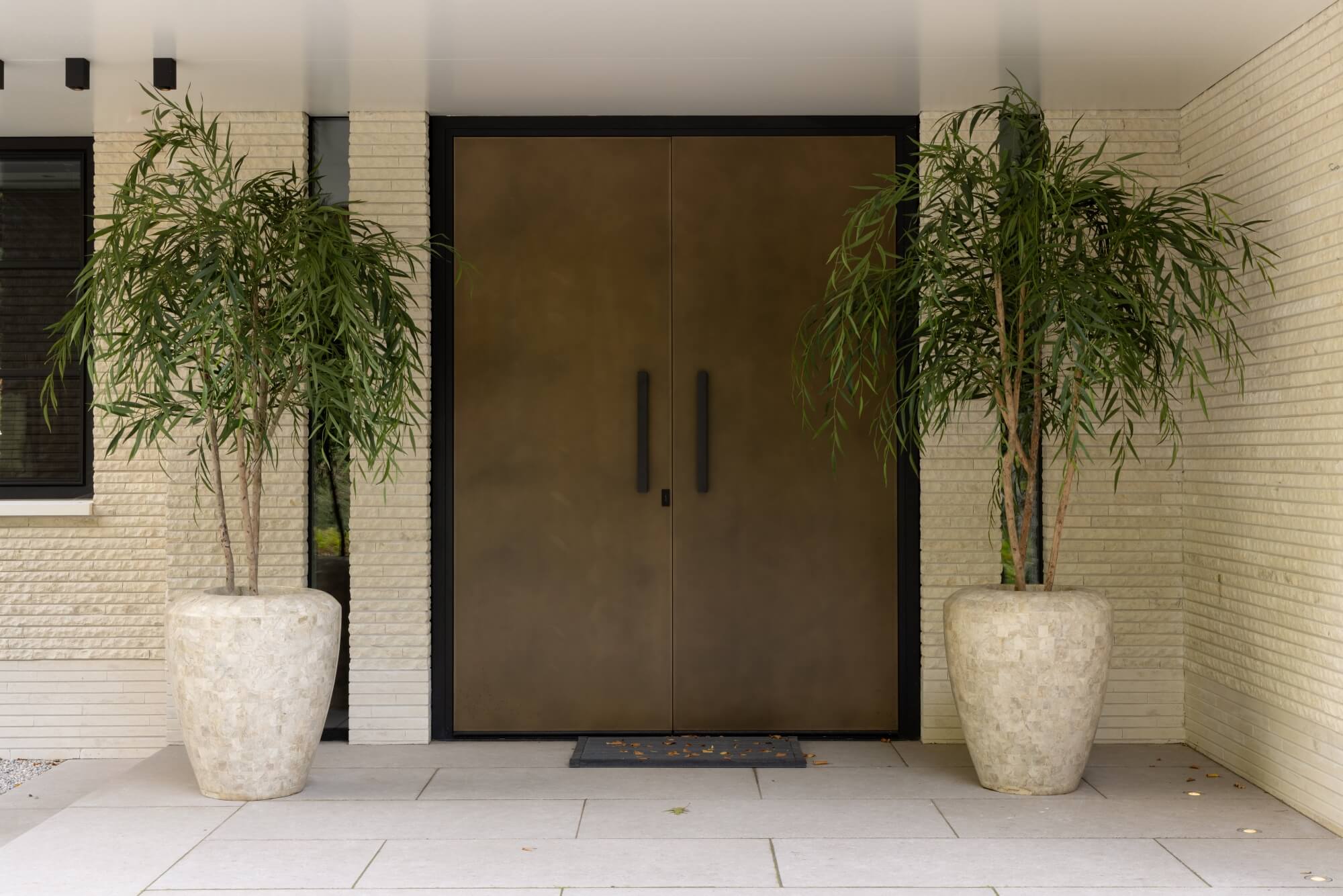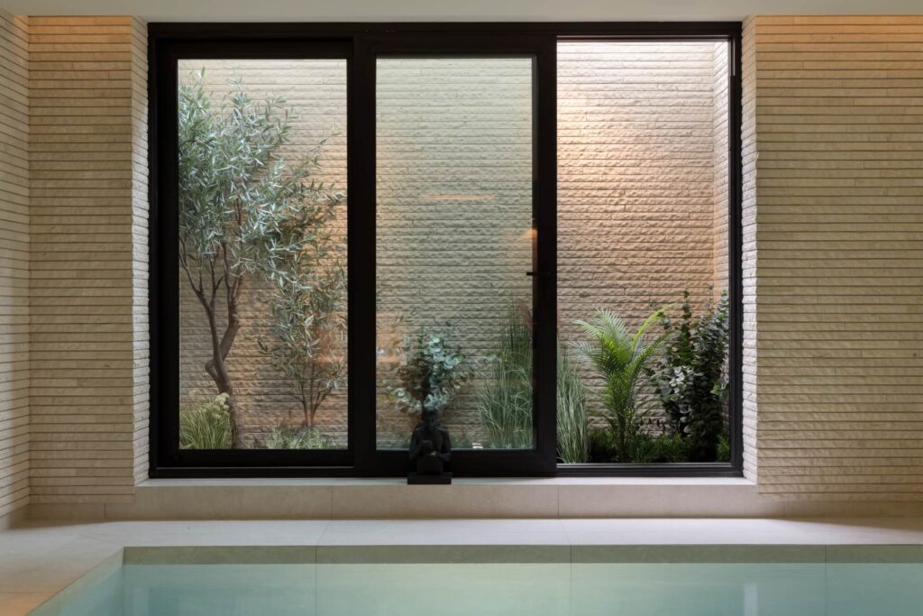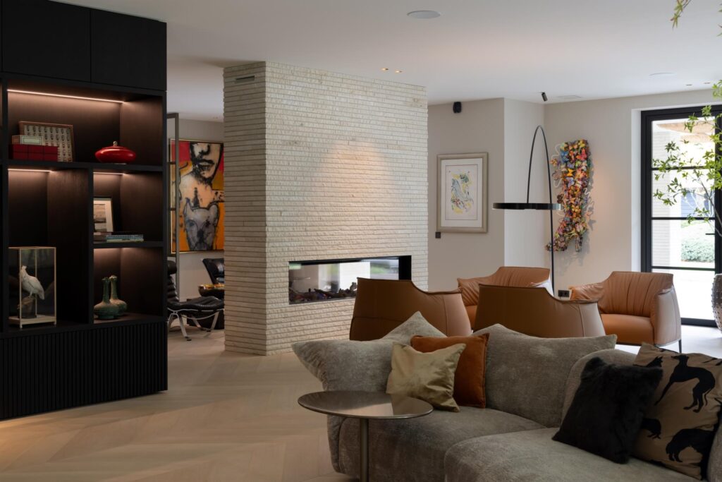 Natural stone remains a defining element throughout the entire project, extending far beyond the façade. The base of the villa is clad in the refined Patras PA28, while the upper façade features the more textured Patras PA16-20, two expressions of the same warm stone family. Lapide Bricks are also applied inside the home, within the wellness, and in carefully designed garden elements, creating a cohesive architectural language from exterior to interior.