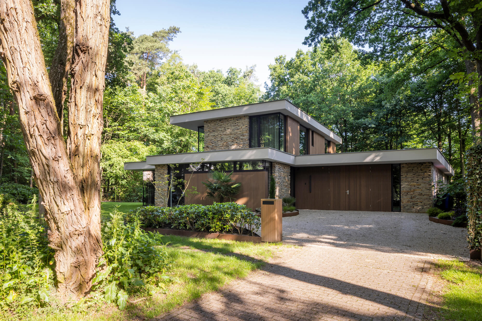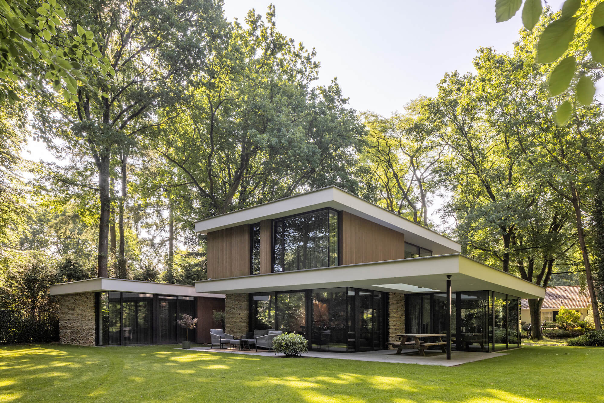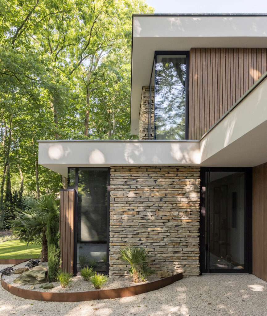Nestled in the prestigious Berg en Bos neighbourhood of Apeldoorn, this luxurious villa blends architectural elegance with the calm of its woodland surroundings. Inspired by the atmosphere of mid-century bungalows, the design feels open, warm and understated, while natural stone brings a timeless presence to the home’s exterior.